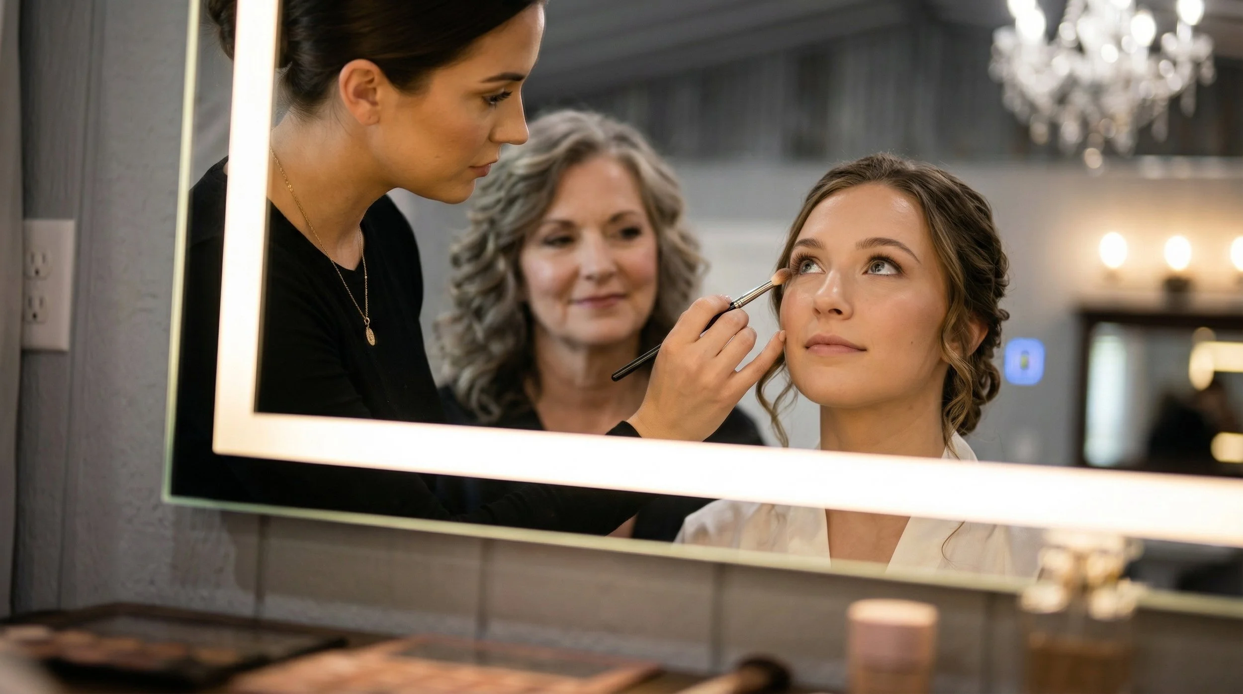 Time moves differently here, not rushed, not rigid, just steady. The makeup and hair artist arrives, unpacks and the bride sits in her chair, enjoying a mimosa.
