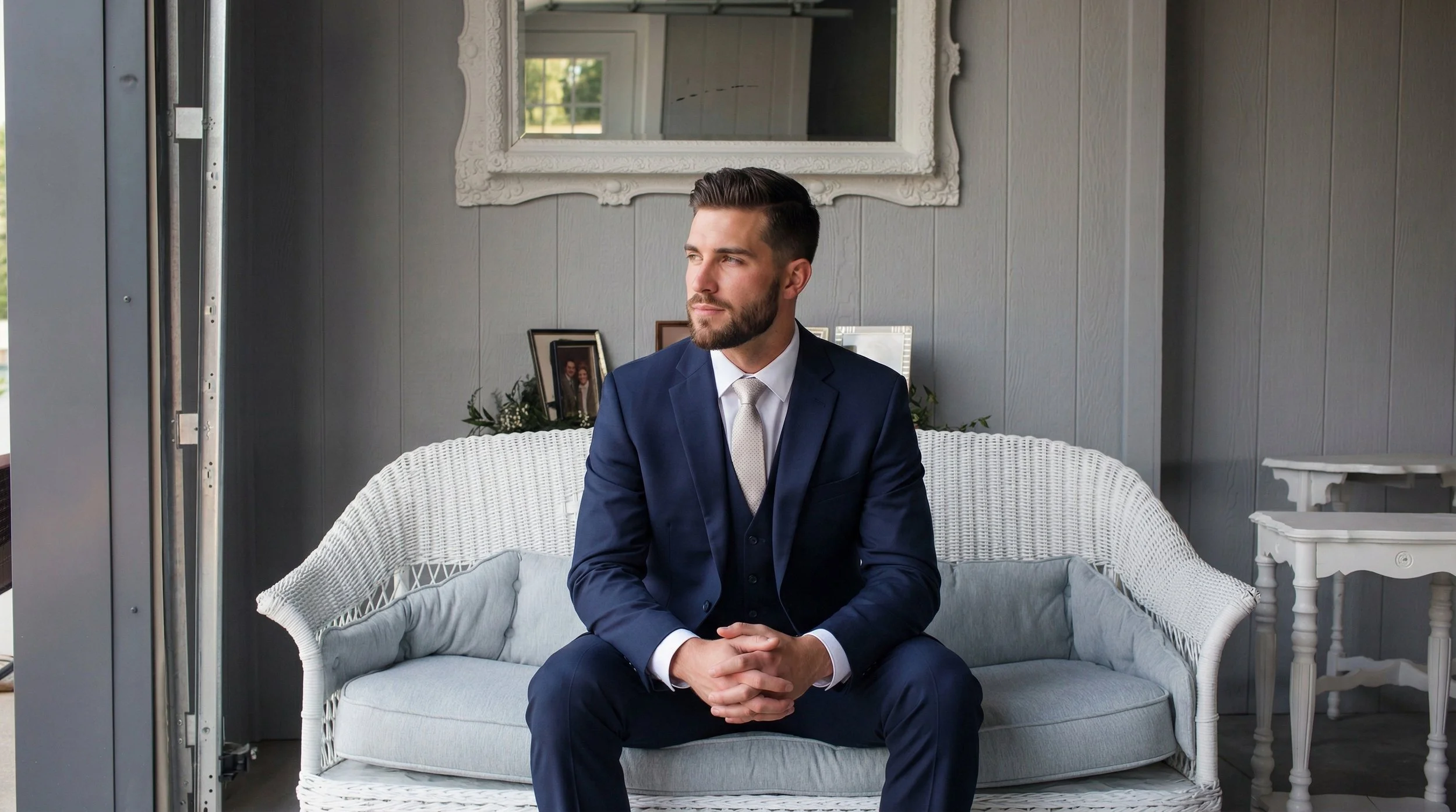 A few steps away, the atmosphere shifts. The groom and groomsmen gather in a quieter rhythm near the front, jackets buttoned, ties adjusted, conversations drifting between lighthearted and reflective. There’s a moment to sit, a moment to look out across the property, a moment to take it all in before everything begins.